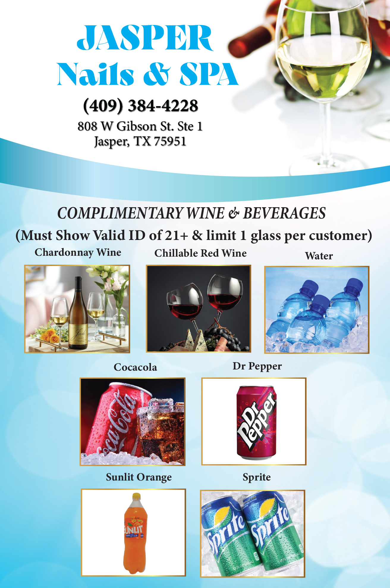 Located conveniently in Jasper, TX 75951, our nail salon pleased to provide the clean and welcome atmosphere, which will make you freely enjoy the relax moments and escape from all of life’s pressure to make the most of wonderful time.